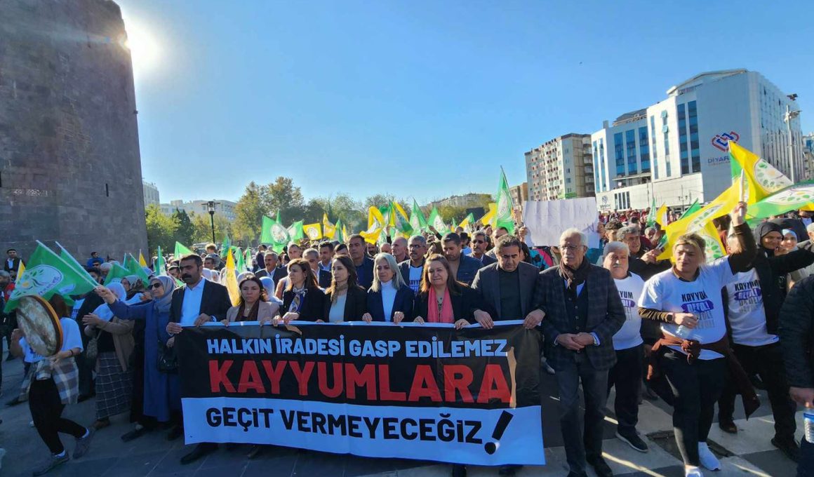 Dağkapı Meydanı’nda biraya gelen kitle buradan Keçi Burcu’na doğru yürüdü. “Halkın iradesi gasp edilen kayyımlara geçit vermeyeceğiz” pankartının açıldığı yürüyüşte, sık sık “AKP halka hesap verecek”, “Jin jiyan azadi” sloganları atıldı.