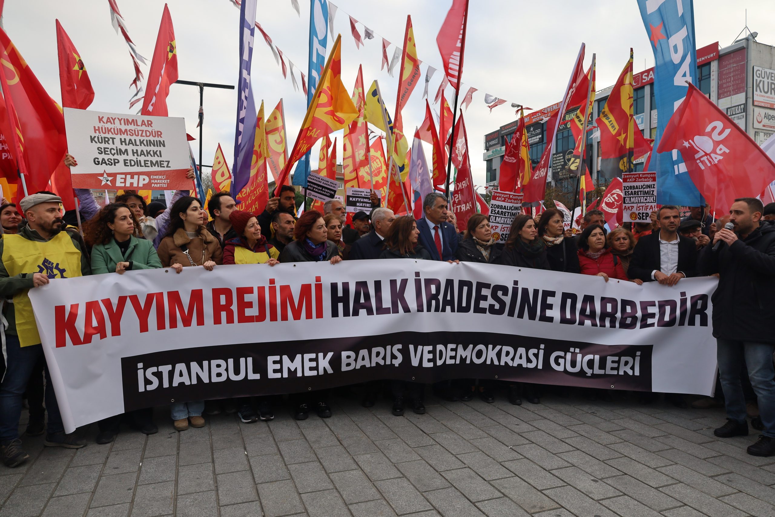 Esenyurt’te İstanbul Emek, Barış ve Demokrasi Güçleri’nin çağrısıyla düzenlenen eylemde, “Kayyum rejimi halk iradesine darbedir” denildi.