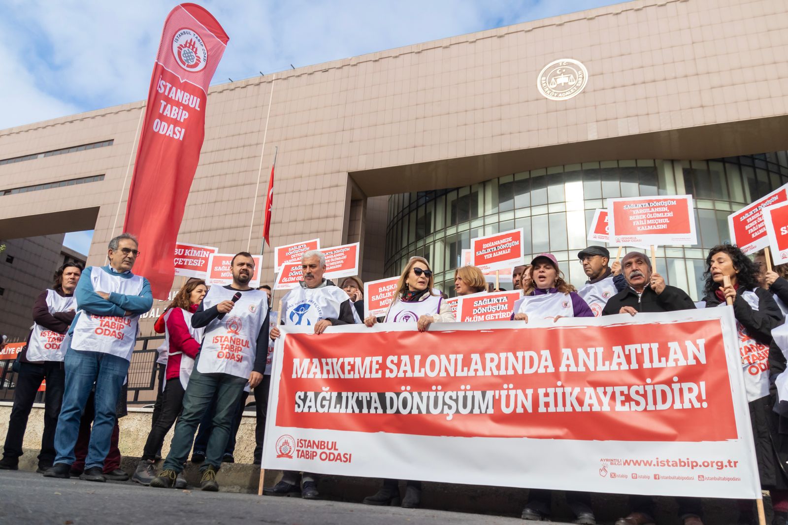 Adliye önünde yapılan eylemde hekimler, ‘Sağlıkta Dönüşüm ölüm getirdi’, ‘Bebek ölümleri faili meçhul kalmasın’ dövizlerini taşıdı.