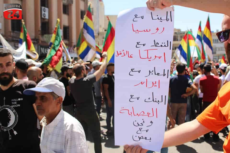 Süveyda’daki protestocuların taşıdığı bir pankart ortak bir duyguyu özetliyor: “Ruslar limana, Amerikalılar petrole, İranlılar sınır kapılarına, rejimin çetesi bankalara sahip ama biz birbirimize sahibiz.”