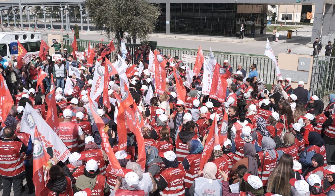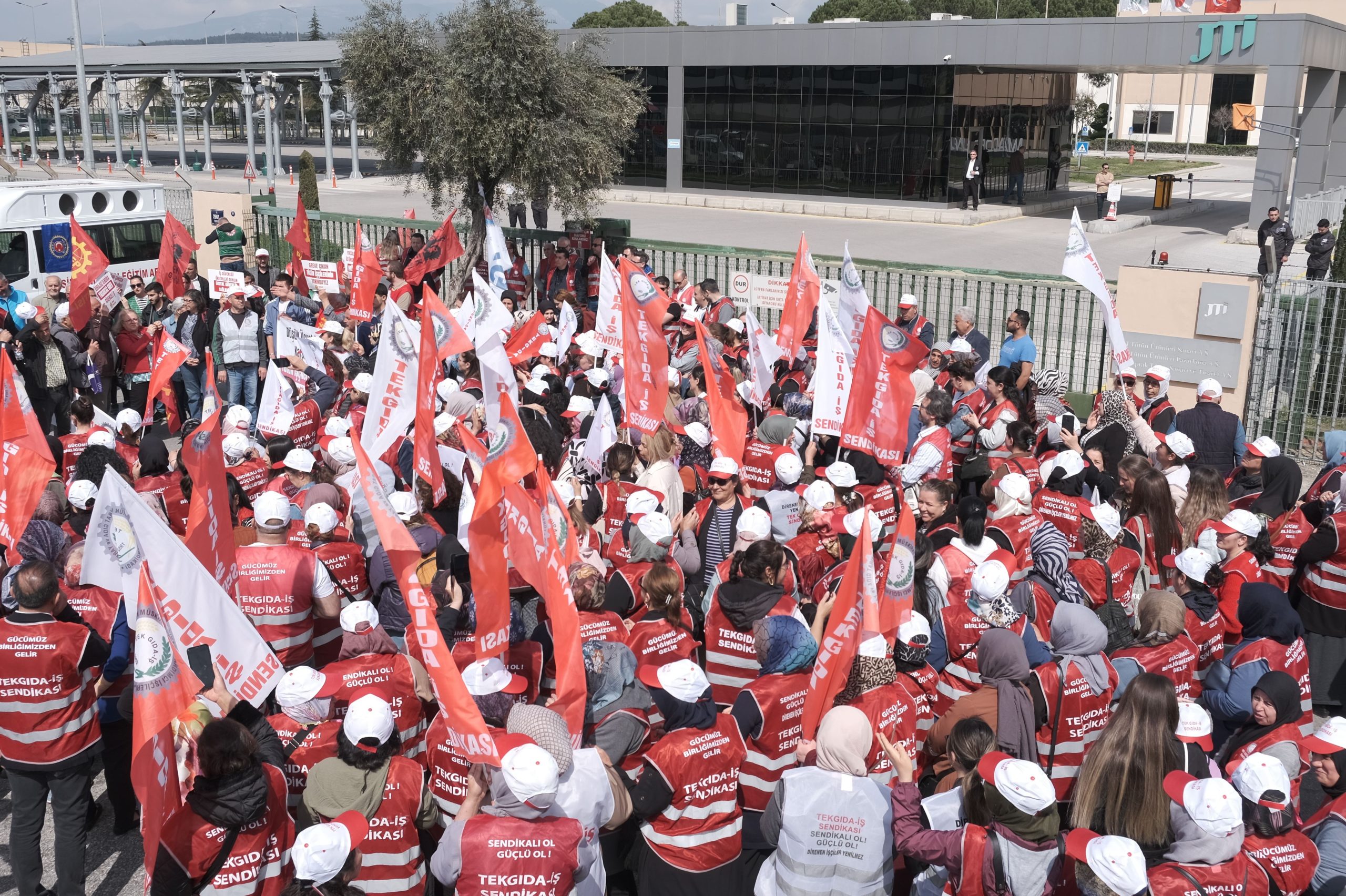 Eylemde konuşan Türk-İş 3. Bölge Temsilcisi Hayrettin Çakmak, 19 gündür üç fabrikada grevin sürdüğünü belirterek, “1990’dan bu yana yabancı sermayeye hizmet veriyoruz. Ancak ne tedarikçisine ne de işçisine asla saygı göstermiyorlar. İşçinin sofrasını bir lokma daha nasıl büyütebiliriz, bunu asla söylemiyorlar. Biz sefalet ücreti istemiyoruz. Sadece kendi kârlarını büyütmek için mücadele ediyorlar, bizim için değil. Buna razı olmayacağız” diye konuştu.