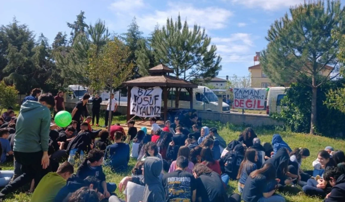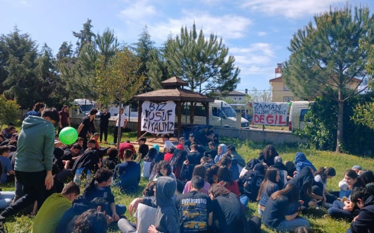 Antalya Yusuf Ziya Öner Fen Lisesi öğrencileri geleneksel festivali “Zaman eğlenme zamanı değil” pankartıyla oturma eylemine çevirdi.