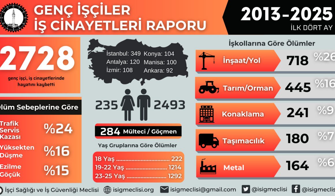 İşçi Sağlığı ve İş Güvenliği Meclisi (İSİG), 2013 yılı ile 2025 yılının ilk 4 ayına ait “Genç İşçiler İş Cinayetleri” raporunu açıkladı.