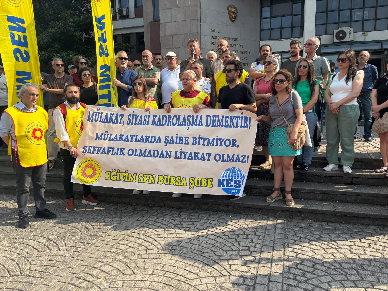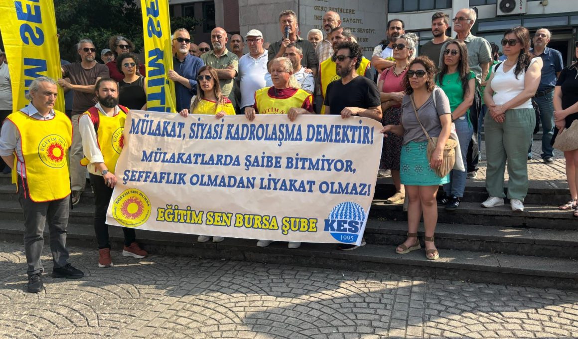 Eğitim Sen Bursa Şubesi, İl Milli Eğitim Müdürlüğü önünde basın açıklaması yaparak, öğretmen atamalarında uygulanan mülakat sistemine tepki gösterdi. “Liyakat esas alınsın” diyen sendika üyeleri, mülakatın derhal kaldırılmasını talep etti.