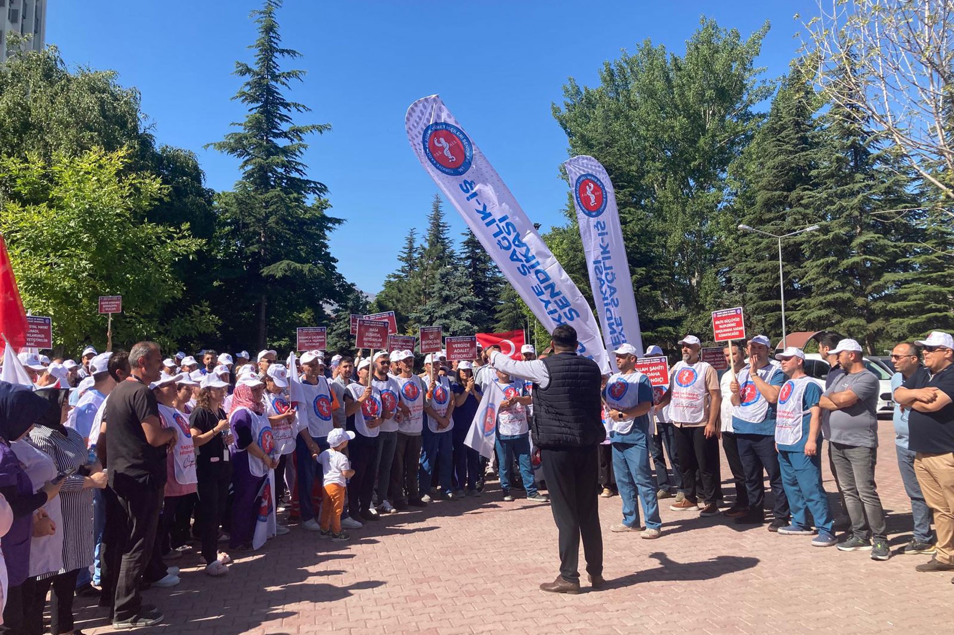 Sağlık-İş üyesi işçiler, hastanelerde basın açıklaması düzenledi. “Sefalet zammını kabul etmiyoruz” diyen işçiler, insanca yaşanacak ücret istedi.