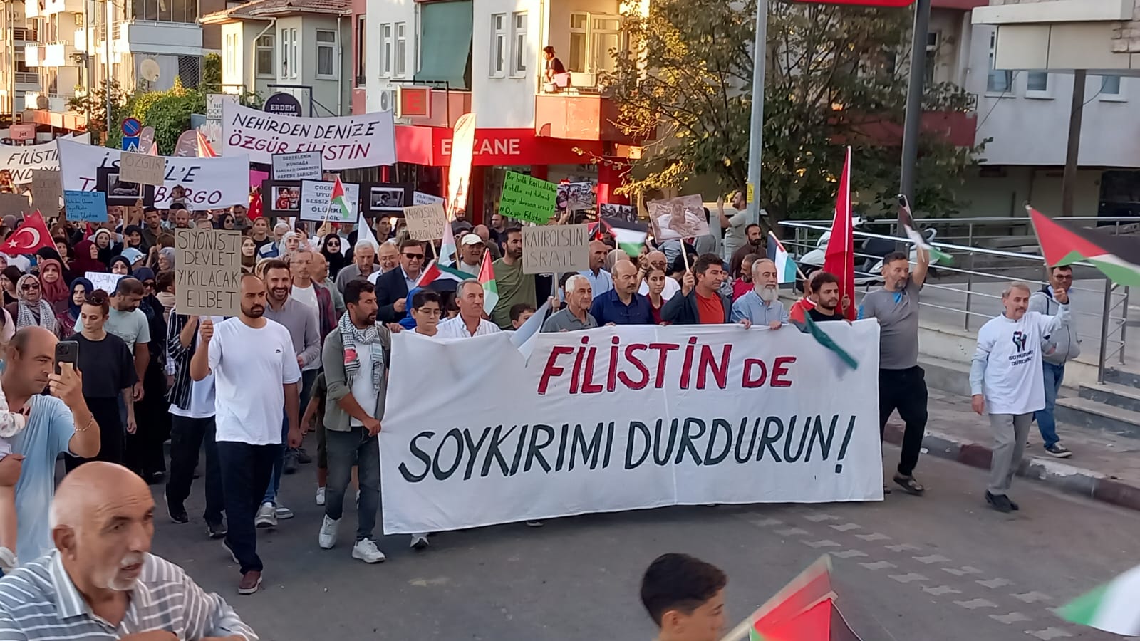 Yürüyüş boyunca sık sık “Nehirden denize özgür Filistin”, “Tam ambargo uygula”, “Netanyahu hesap ver bugün kaç çocuk öldürdün”, “Katil İsrail, katil ABD”, “Siyonist devlet yıkılacak elbet” sloganları atıldı.