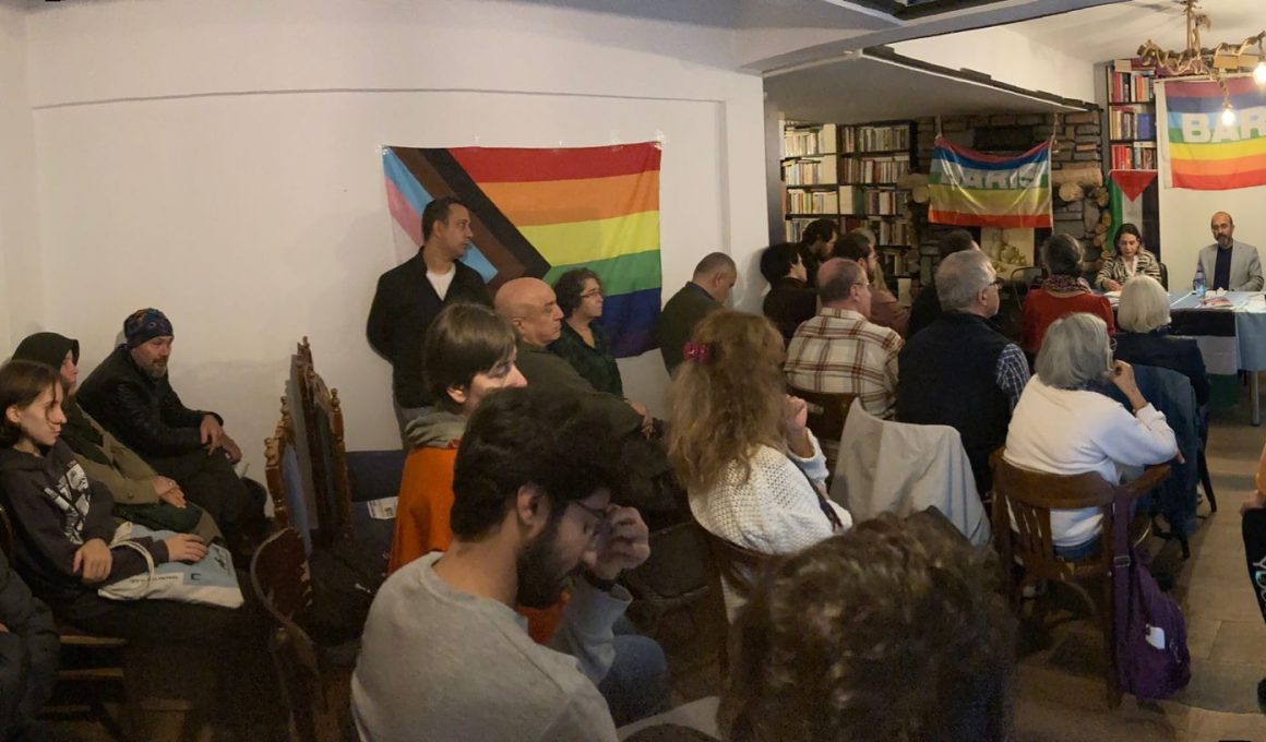 Kadıköy’de Moda Kitapevi’nde gerçekleştirilen Enternasyonal Dayanışma toplantılarının yapıldığı salonun duvarlarında Filistin ve barış bayrakları yer aldı.