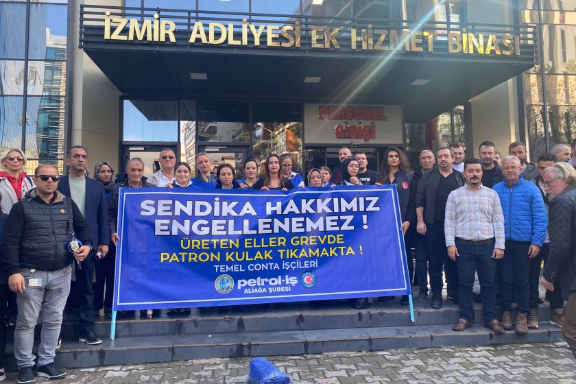 İzmir Kemalpaşa’da337 gündür sendika ve toplu sözleşme hakları için direnen Temel Conta işçilerinin, işverenin grev kırıcılığına karşı açtığı davanın 2’nci duruşması yapıldı. Mahkeme 8 Ocak tarihine ertelendi. Duruşmanın ardından basın açıklaması düzenlendi. (11 Kasım)