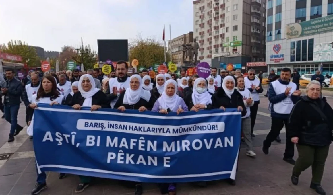 Yürüyüşte, ‘Jin, jiyan, azadî’, (kadın, yaşam, özgürlük), ‘Em şer naxwazın, aşitiye duxwazın’ (Savaşa hayır, barış hemen şimdi) sloganları atıldı. Alkış ve zılgıtlarla gerçekleştirilen yürüyüşte, beyaz tülbentli anneler en önde yer aldı. Yürüyüşün ardından 63 sivil toplum ve meslek örgütünün imzasının yer aldığı açıklamayı İnsan Hakları Derneği (İHD) Eş Genel Başkan Yardımcısı ve İHD Diyarbakır Şube Başkanı Ercan Yılmaz okudu.