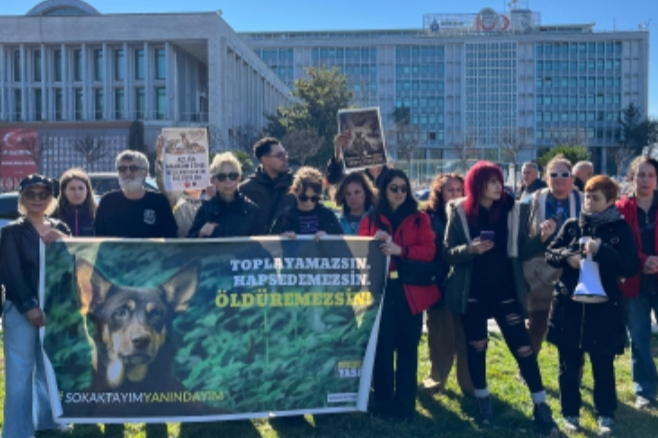 Yaşam İçin Yasa Kolektifi, İBB önünde yaptığı eylemde, hayvanların barınaklarda tecrit edildiğini, ölümlerin gizlendiğini ve yaşam hakkının sistematik biçimde ihlal edildiğini söyledi.