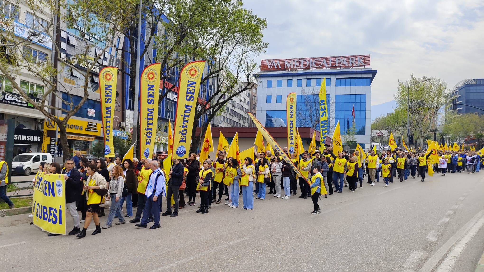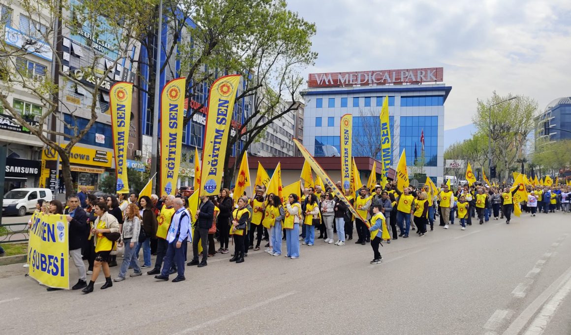 Bursa’da Eğitim Sen, Eğitim İş, TÖB-SEN, Hürriyetçi Eğitim Sen, Eğitim Gücü Sen, Öğretmenler Sendikası, Devlet Memurları Eğitim Sendikası’nın çağrısıyla Fomara meydanında bir araya gelen binlerce öğretmen il milli eğitim müdürlüğüne yürüdü. Eyleme Enternasyonal Dayanışma aktivistleri de katıldı.
