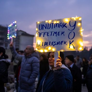 Depremin ikinci yıl dönümünde Hatay’da düzenlenen yürüyüşte, kenti yeniden inşa edeceklerini ve sorumlulardan hesap soracaklarını belirterek, ‘Unutmak yok,…